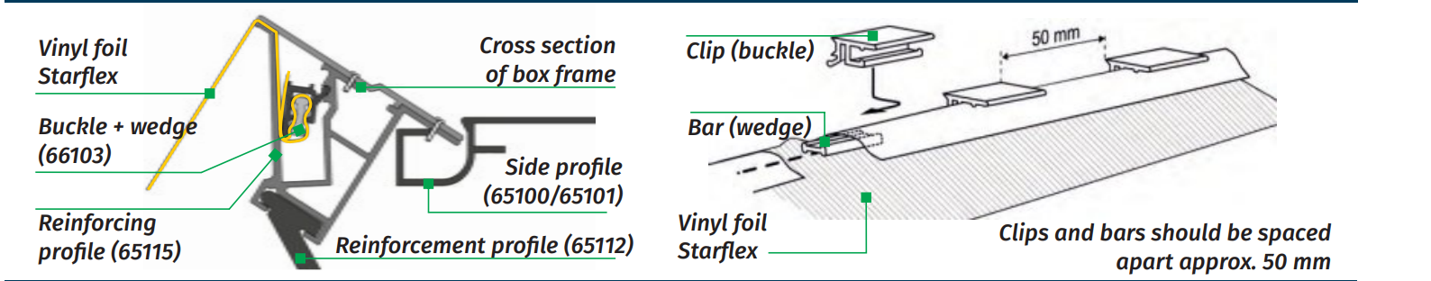 The great advantage of this system is its low weight and ideally flat area. By removing the cover strip, the front side is simply opened and therefore it is not necessary to remove or interfere with the stretched banner. Profiles are welded together.