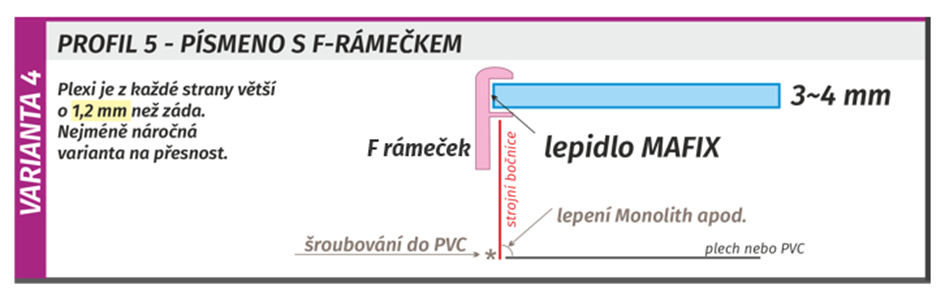 F rámeček je nezbytnou součástí lemu světelných písmen a reklamních nápisů a tvarů. Je vhodný pro ukotvení plexiskla v tloušťce 3 mm k plastickým písmenům nebo jiným složitějším tvarům. Vhodné pro tvary do výšky 80 cm.