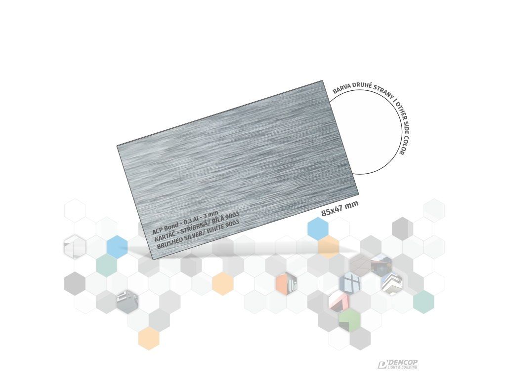 Vzorka ACP Bond dosky (0,3/3mm, kartáčovaná strieborná/biela RAL 9003). Ideálna voľba pre fyzické overenie farby a materiálu, vďaka ktorej získate istotu pred vašou konečnou realizáciou.