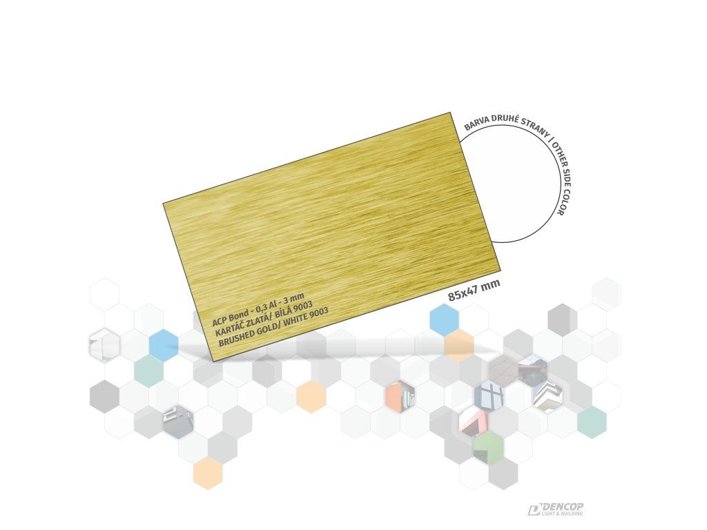 Vzorka ACP Bond dosky (0,3/3mm, kartáčovaná zlatá/biela RAL 9003). Ideálna voľba pre fyzické overenie farby a materiálu, vďaka ktorej získate istotu pred vašou konečnou realizáciou.